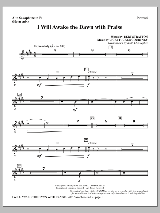 Download or print Vicki Tucker Courtney I Will Awake The Dawn With Praise - Alto Sax (sub. Horn) sheet music, chords and digital score arranged for Choir Instrumental Pak. This Concert score includes 9 page(s).