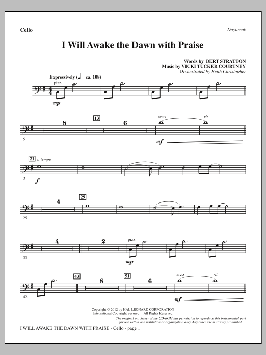 Download or print Vicki Tucker Courtney I Will Awake The Dawn With Praise - Cello sheet music, chords and digital score arranged for Choir Instrumental Pak. This Concert score includes 9 page(s).