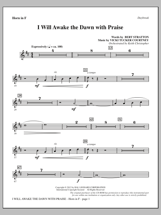 Download or print Vicki Tucker Courtney I Will Awake The Dawn With Praise - F Horn sheet music, chords and digital score arranged for Choir Instrumental Pak. This Concert score includes 9 page(s).
