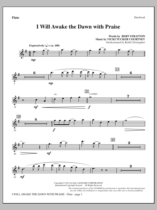 Download or print Vicki Tucker Courtney I Will Awake The Dawn With Praise - Flute sheet music, chords and digital score arranged for Choir Instrumental Pak. This Concert score includes 9 page(s).