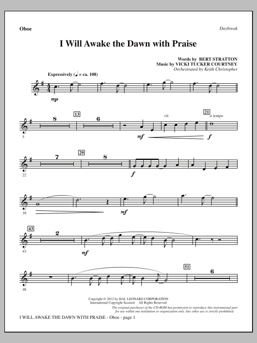 Download or print Vicki Tucker Courtney I Will Awake The Dawn With Praise - Oboe sheet music, chords and digital score arranged for Choir Instrumental Pak. This Concert score includes 9 page(s).