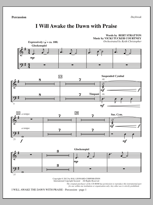 Download or print Vicki Tucker Courtney I Will Awake The Dawn With Praise - Percussion sheet music, chords and digital score arranged for Choir Instrumental Pak. This Concert score includes 9 page(s).