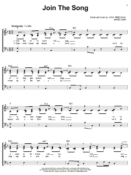 Download or print Vicky Beeching Join The Song sheet music, chords and digital score arranged for Piano, Vocal & Guitar Chords (Right-Hand Melody). This Christian score includes 5 page(s).