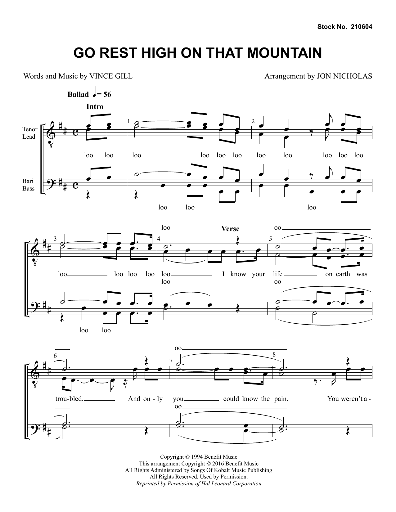Download or print Vince Gill Go Rest High on That Mountain (arr. Jon Nicholas) sheet music, chords and digital score arranged for TTBB Choir. This Barbershop score includes 6 page(s).