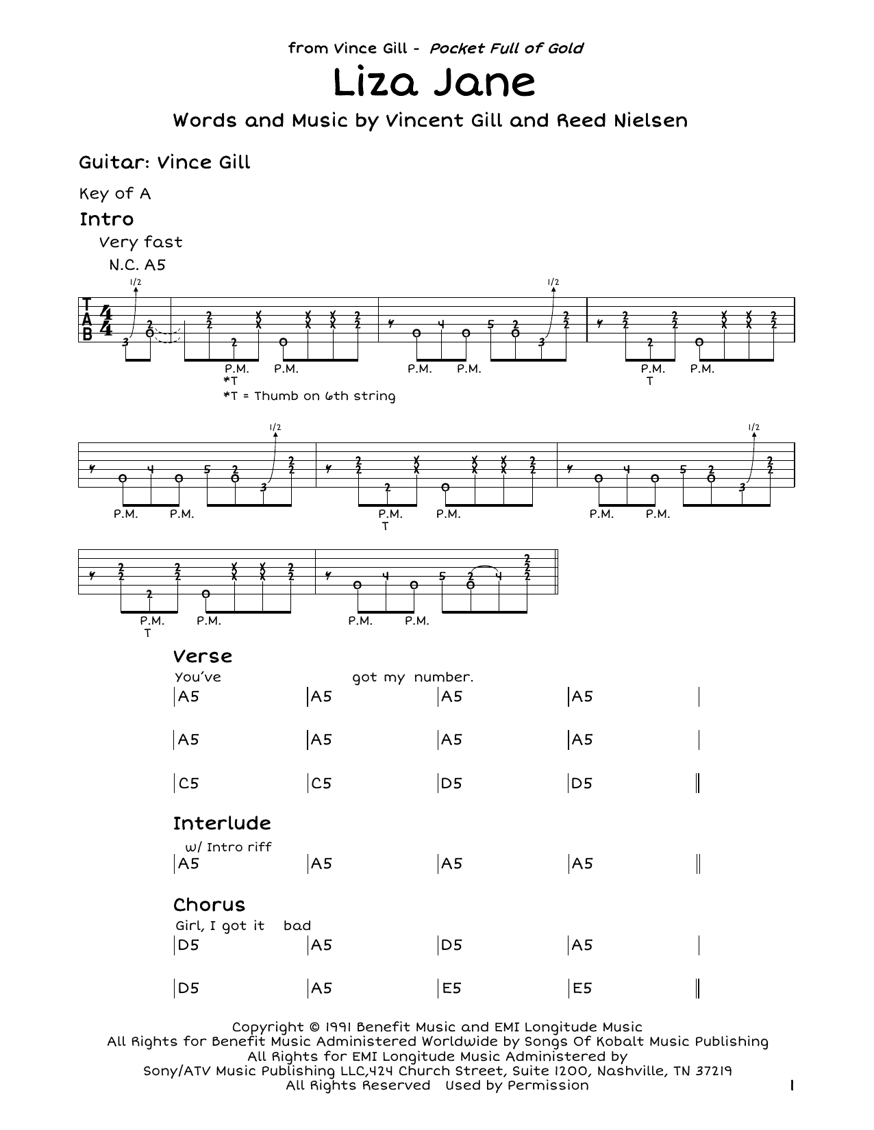 Download or print Vince Gill Liza Jane sheet music, chords and digital score arranged for Guitar Lead Sheet. This Country score includes 3 page(s).