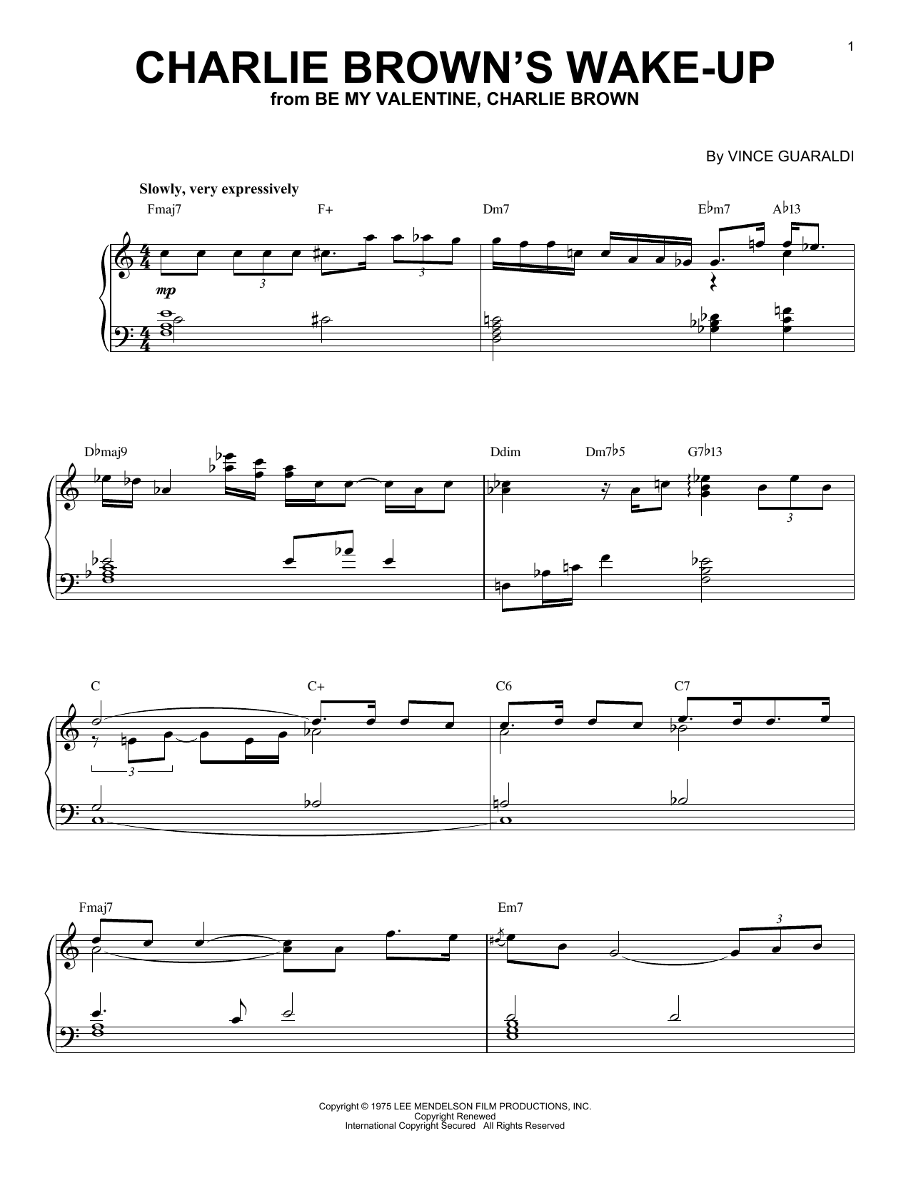 Download or print Vince Guaraldi Charlie Brown's Wake-Up sheet music, chords and digital score arranged for Piano Solo. This Film/TV score includes 2 page(s).
