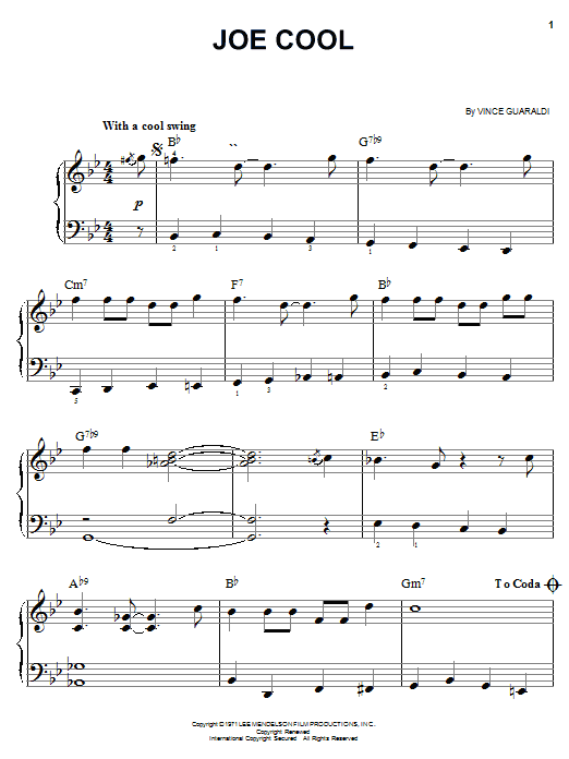 Download or print Vince Guaraldi Joe Cool sheet music, chords and digital score arranged for Piano, Vocal & Guitar Chords (Right-Hand Melody). This Children score includes 6 page(s).
