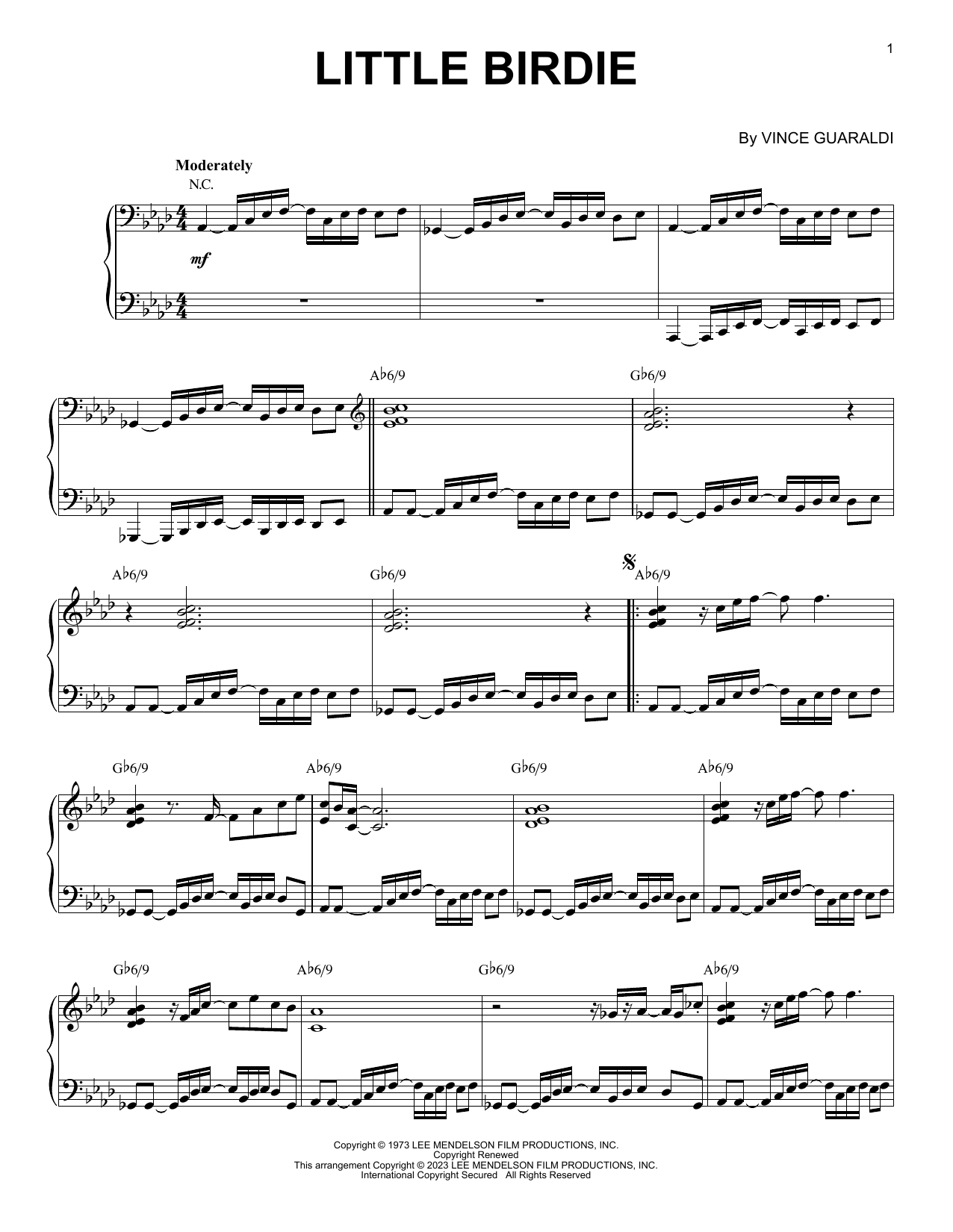 Download or print Vince Guaraldi Little Birdie [Jazz version] (arr. Brent Edstrom) sheet music, chords and digital score arranged for Piano Solo. This Jazz score includes 2 page(s).