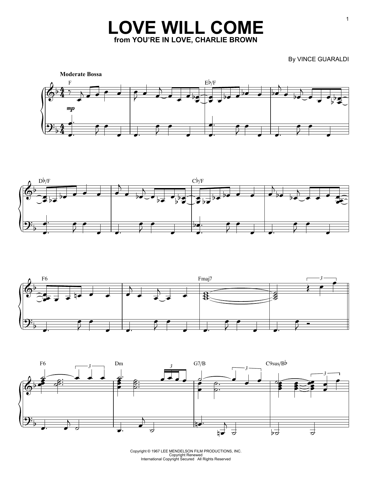 Download or print Vince Guaraldi Love Will Come (from You're In Love, Charlie Brown) sheet music, chords and digital score arranged for Piano Solo. This Children score includes 3 page(s).