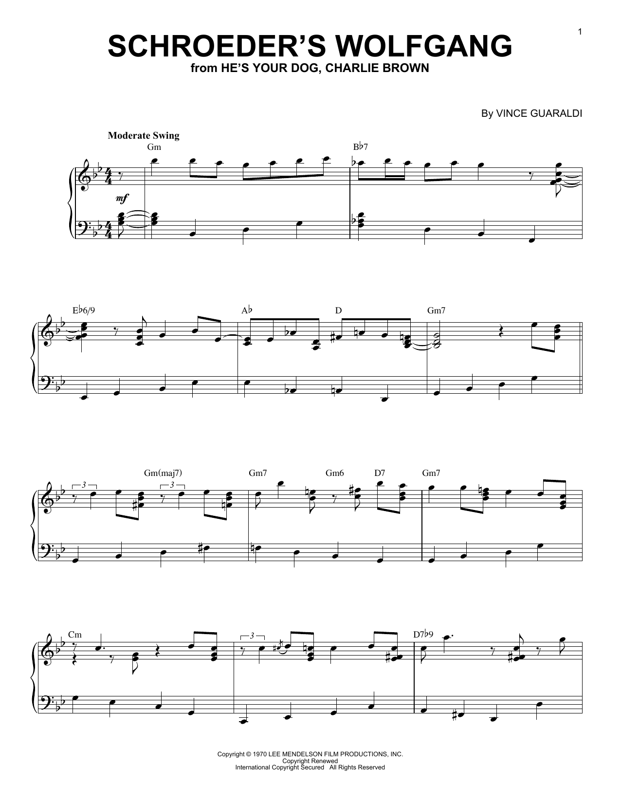 Download or print Vince Guaraldi Schroeder's Wolfgang sheet music, chords and digital score arranged for Piano Solo. This Film/TV score includes 2 page(s).