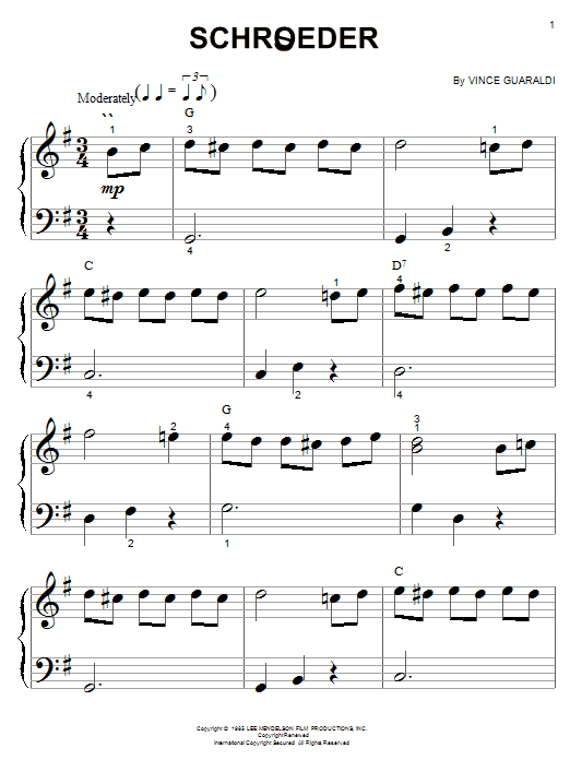 Download or print Vince Guaraldi Schroeder sheet music, chords and digital score arranged for 5-Finger Piano. This Jazz score includes 4 page(s).