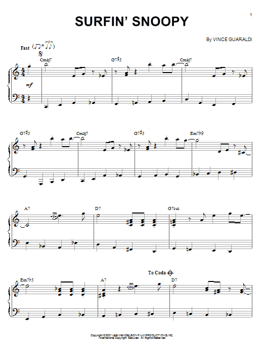 Download or print Vince Guaraldi Surfin' Snoopy sheet music, chords and digital score arranged for Easy Piano. This Children score includes 3 page(s).