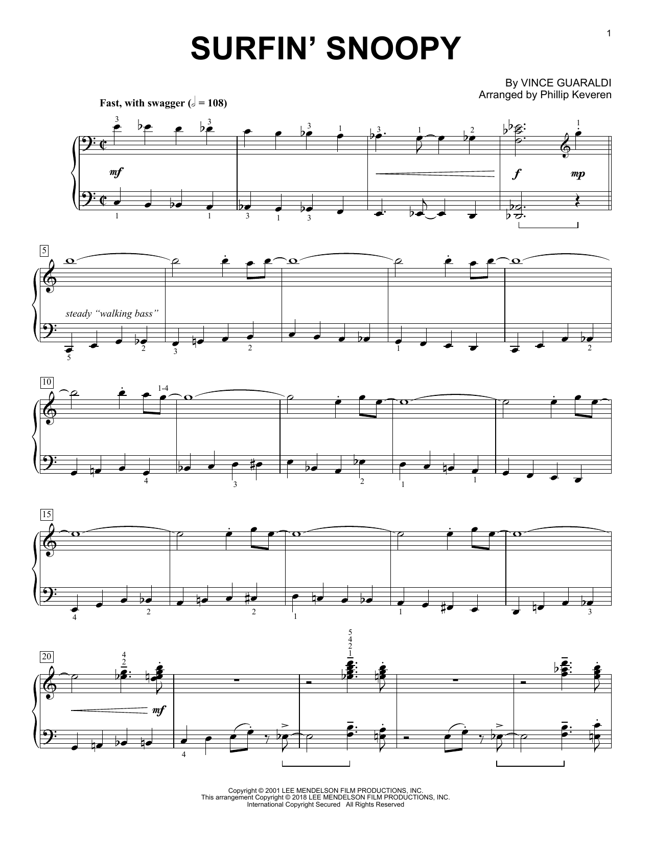 Download or print Vince Guaraldi Surfin' Snoopy (arr. Phillip Keveren) sheet music, chords and digital score arranged for Piano Solo. This Children score includes 2 page(s).