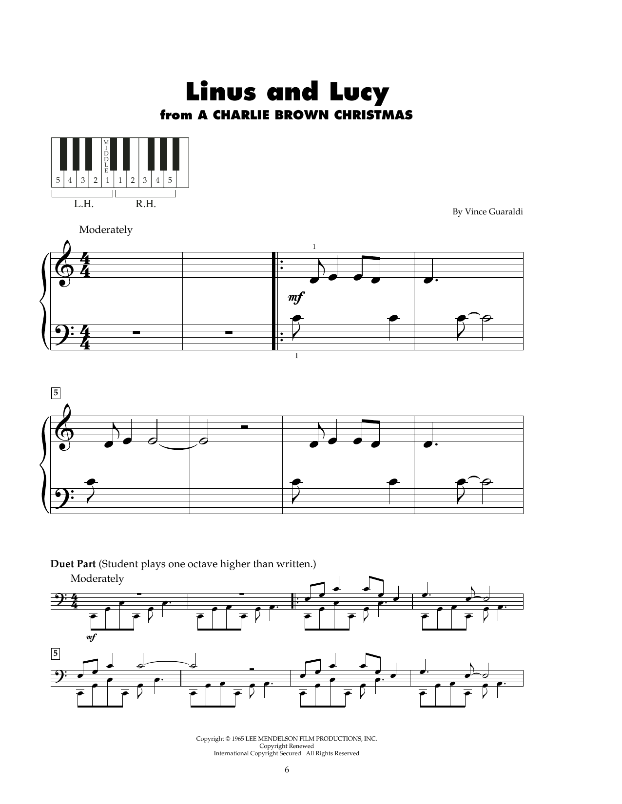 Download or print Vince Guaraldi Trio Linus And Lucy sheet music, chords and digital score arranged for 5-Finger Piano. This Children score includes 4 page(s).