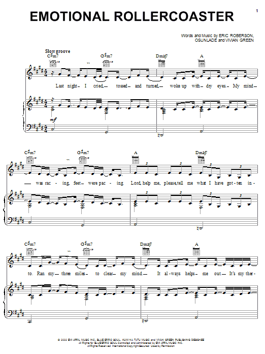 Download or print Vivian Green Emotional Rollercoaster sheet music, chords and digital score arranged for Piano, Vocal & Guitar Chords (Right-Hand Melody). This Pop score includes 6 page(s).