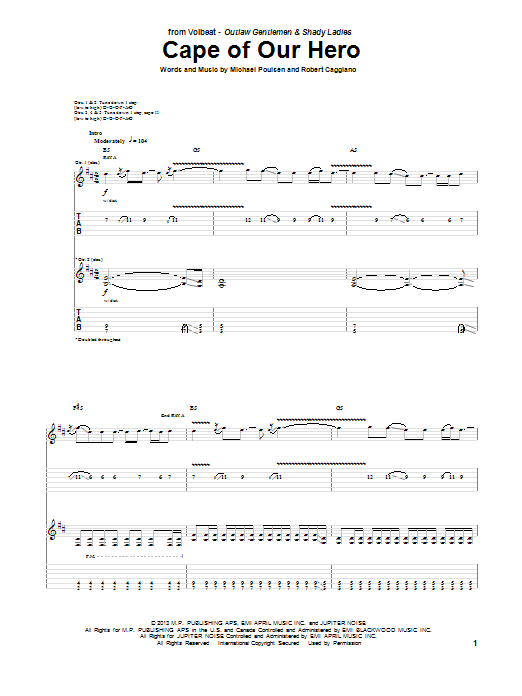 Download or print Volbeat Cape Of Our Hero sheet music, chords and digital score arranged for Guitar Tab. This Pop score includes 9 page(s).
