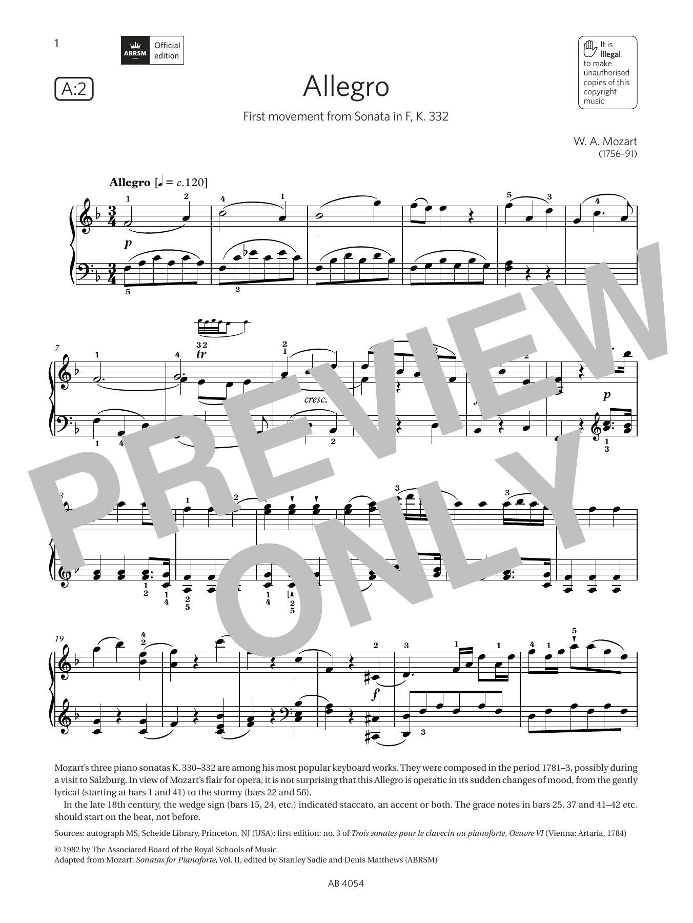 Download or print W A Mozart Allegro (Grade 8, list A2, from the ABRSM Piano Syllabus 2023 & 2024) sheet music, chords and digital score arranged for Piano Solo. This Classical score includes 8 page(s).
