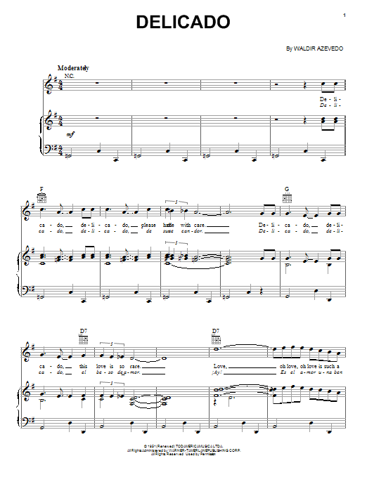 Download or print Waldir Azevedo Delicado sheet music, chords and digital score arranged for Piano, Vocal & Guitar Chords (Right-Hand Melody). This Jazz score includes 5 page(s).