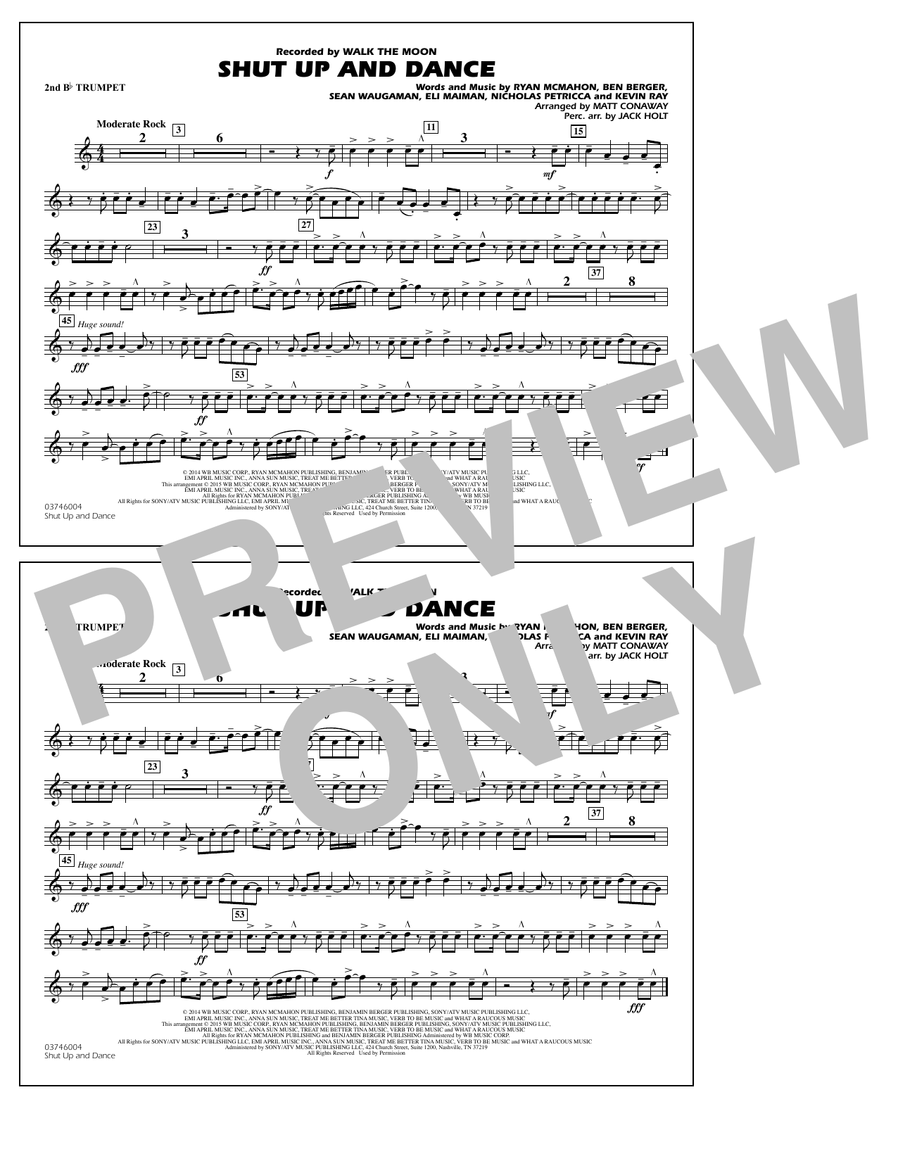 Download or print Walk The Moon Shut Up and Dance (Arr. Matt Conaway) - 2nd Bb Trumpet sheet music, chords and digital score arranged for Marching Band. This Pop score includes 1 page(s).