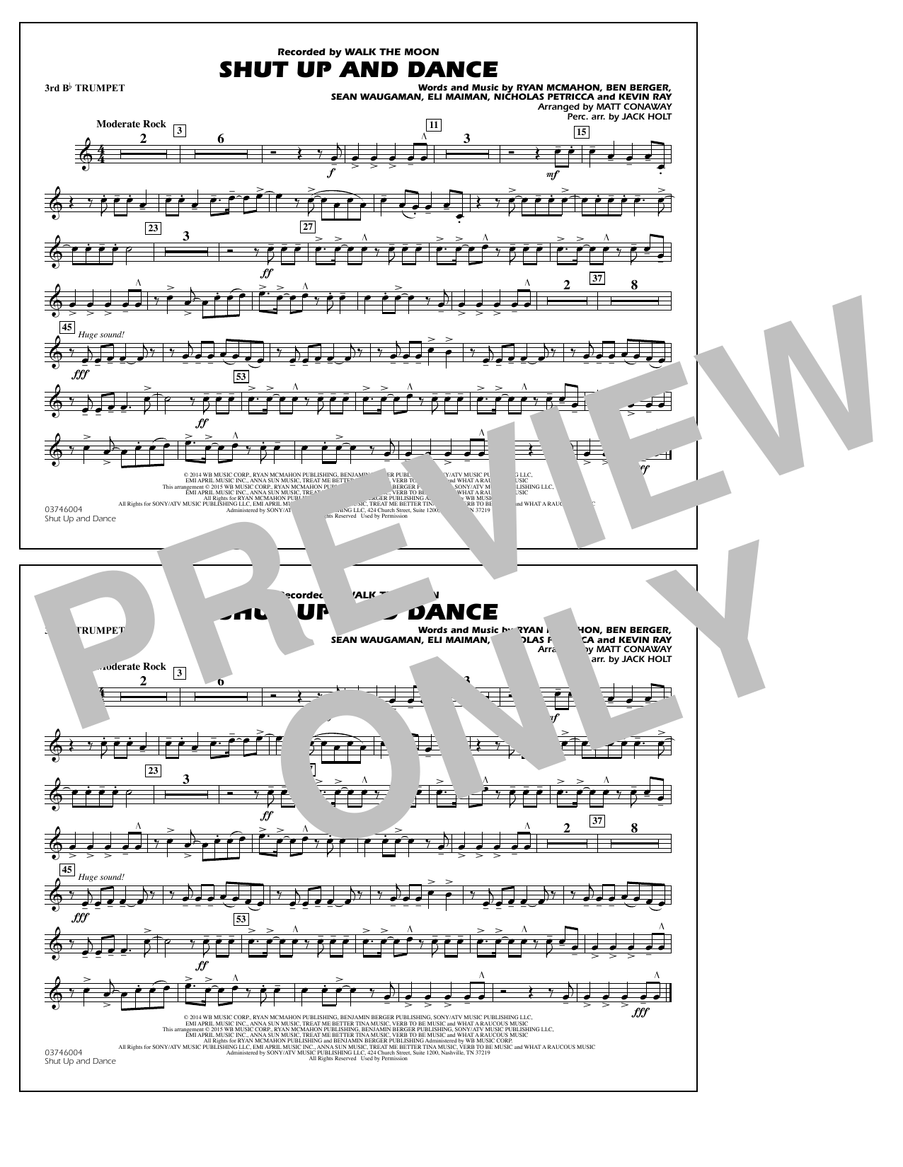 Download or print Walk The Moon Shut Up and Dance (Arr. Matt Conaway) - 3rd Bb Trumpet sheet music, chords and digital score arranged for Marching Band. This Pop score includes 1 page(s).