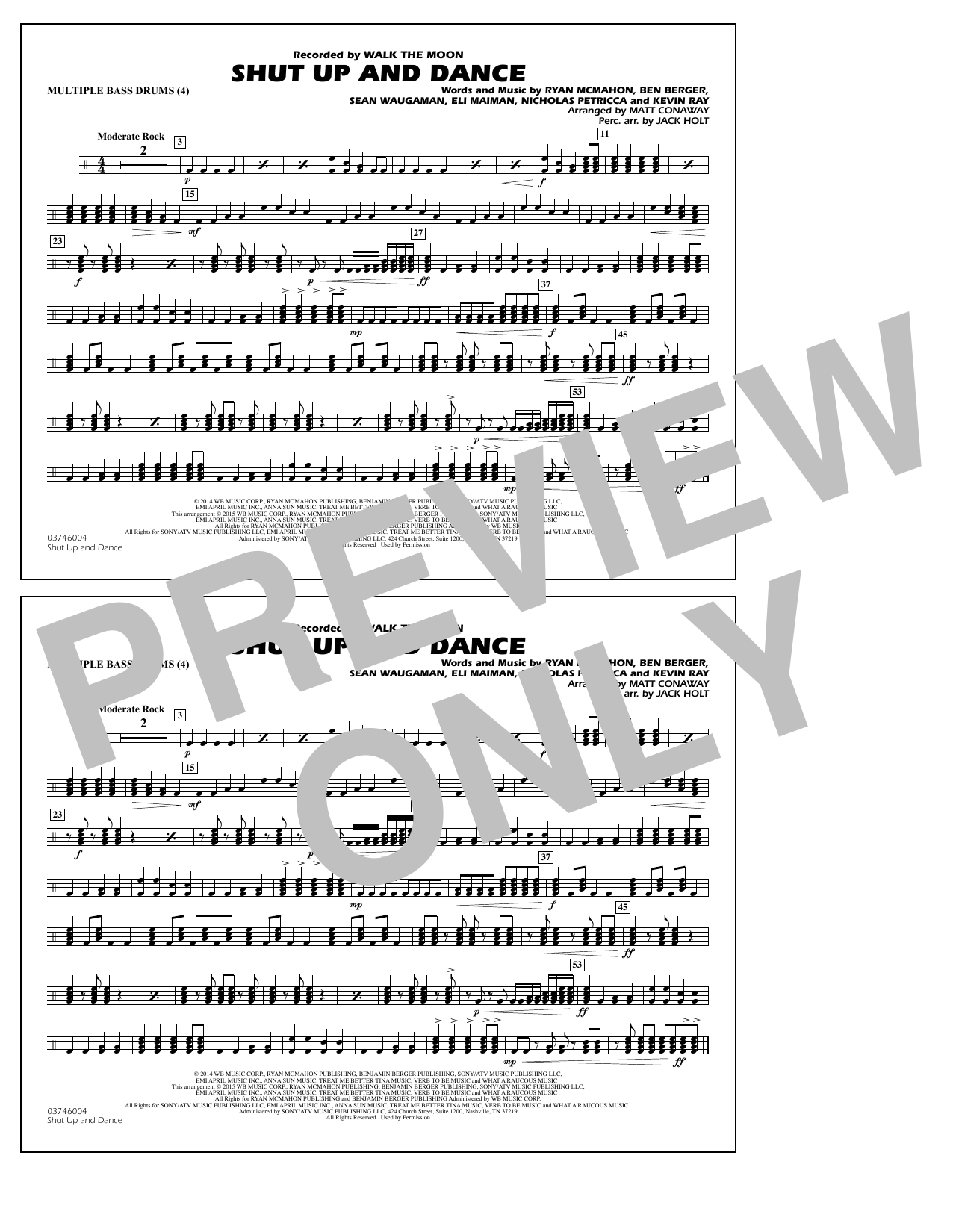 Download or print Walk The Moon Shut Up and Dance (Arr. Matt Conaway) - Multiple Bass Drums sheet music, chords and digital score arranged for Marching Band. This Pop score includes 1 page(s).