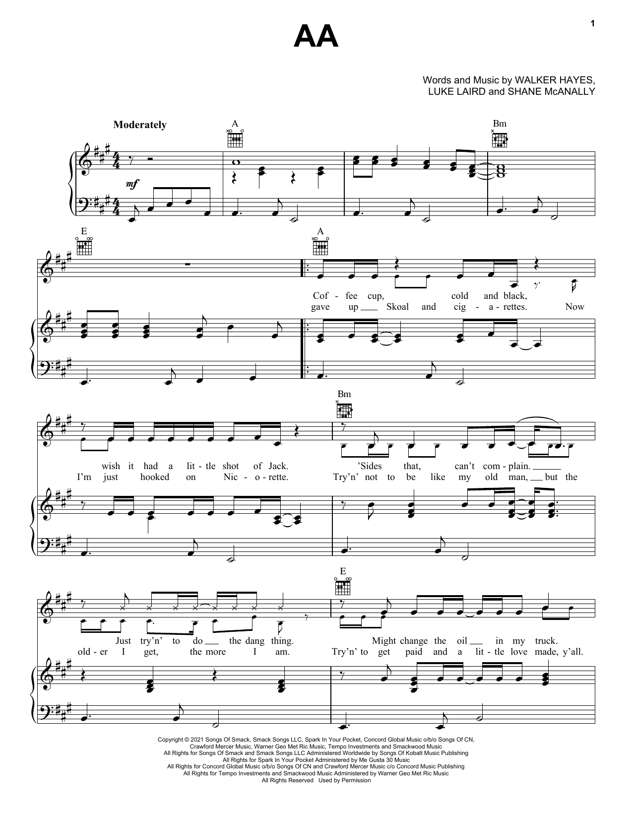 Download or print Walker Hayes AA sheet music, chords and digital score arranged for Piano, Vocal & Guitar Chords (Right-Hand Melody). This Country score includes 4 page(s).