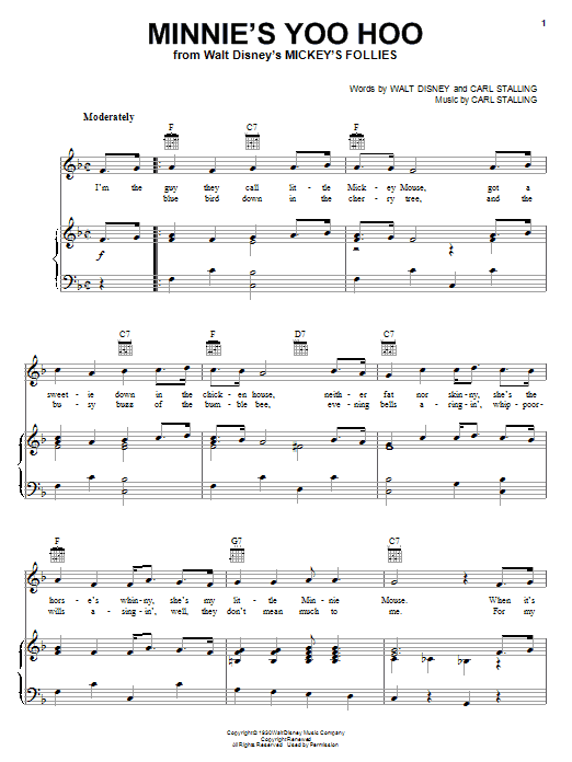 Download or print Walt Disney Minnie's Yoo Hoo sheet music, chords and digital score arranged for Piano, Vocal & Guitar Chords (Right-Hand Melody). This Children score includes 3 page(s).
