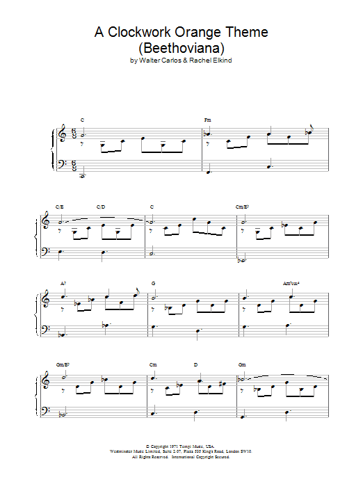 Download or print Walter Carlos A Clockwork Orange Theme (Beethoviana) sheet music, chords and digital score arranged for Piano Solo. This Film/TV score includes 2 page(s).