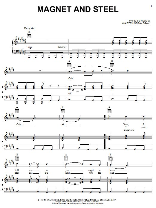 Download or print Walter Egan Magnet And Steel sheet music, chords and digital score arranged for Piano, Vocal & Guitar Chords (Right-Hand Melody). This Pop score includes 4 page(s).