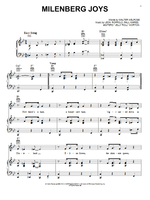 Download or print Walter Melrose Milenberg Joys sheet music, chords and digital score arranged for Piano, Vocal & Guitar Chords (Right-Hand Melody). This Jazz score includes 5 page(s).