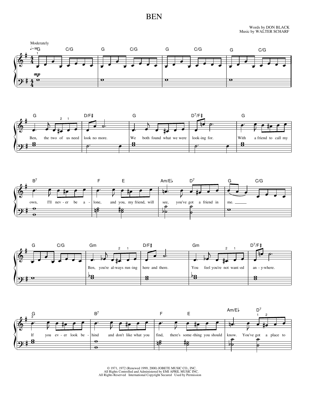 Download or print Walter Scharf Ben sheet music, chords and digital score arranged for Piano, Vocal & Guitar Chords (Right-Hand Melody). This Pop score includes 2 page(s).