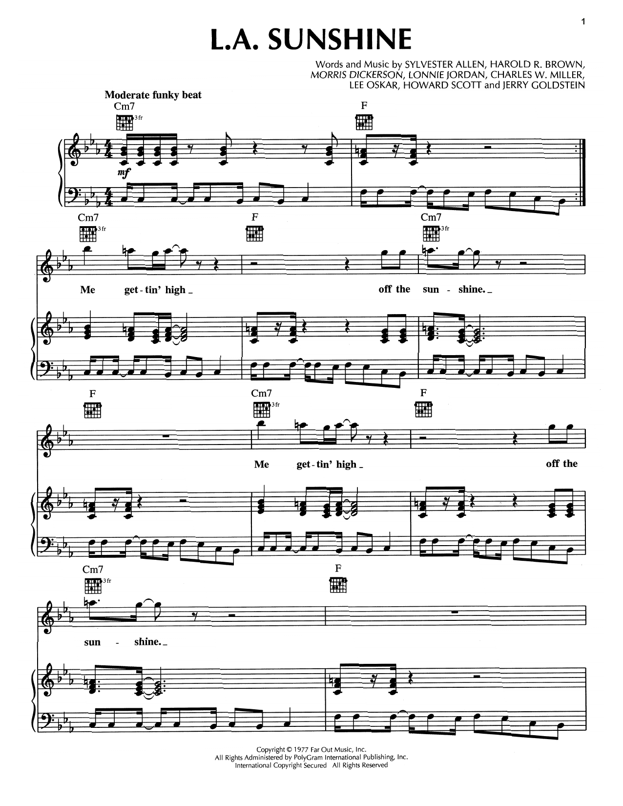 Download or print War L.A. Sunshine sheet music, chords and digital score arranged for Piano, Vocal & Guitar Chords (Right-Hand Melody). This Funk score includes 5 page(s).