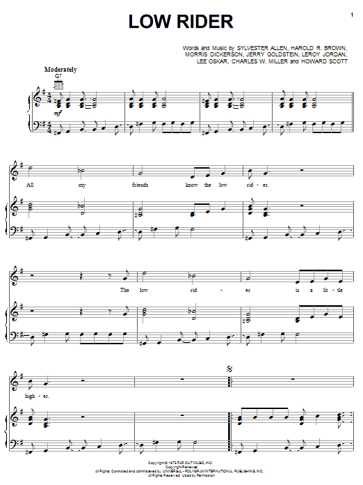 Download or print War Low Rider sheet music, chords and digital score arranged for Piano, Vocal & Guitar Chords (Right-Hand Melody). This Funk score includes 4 page(s).