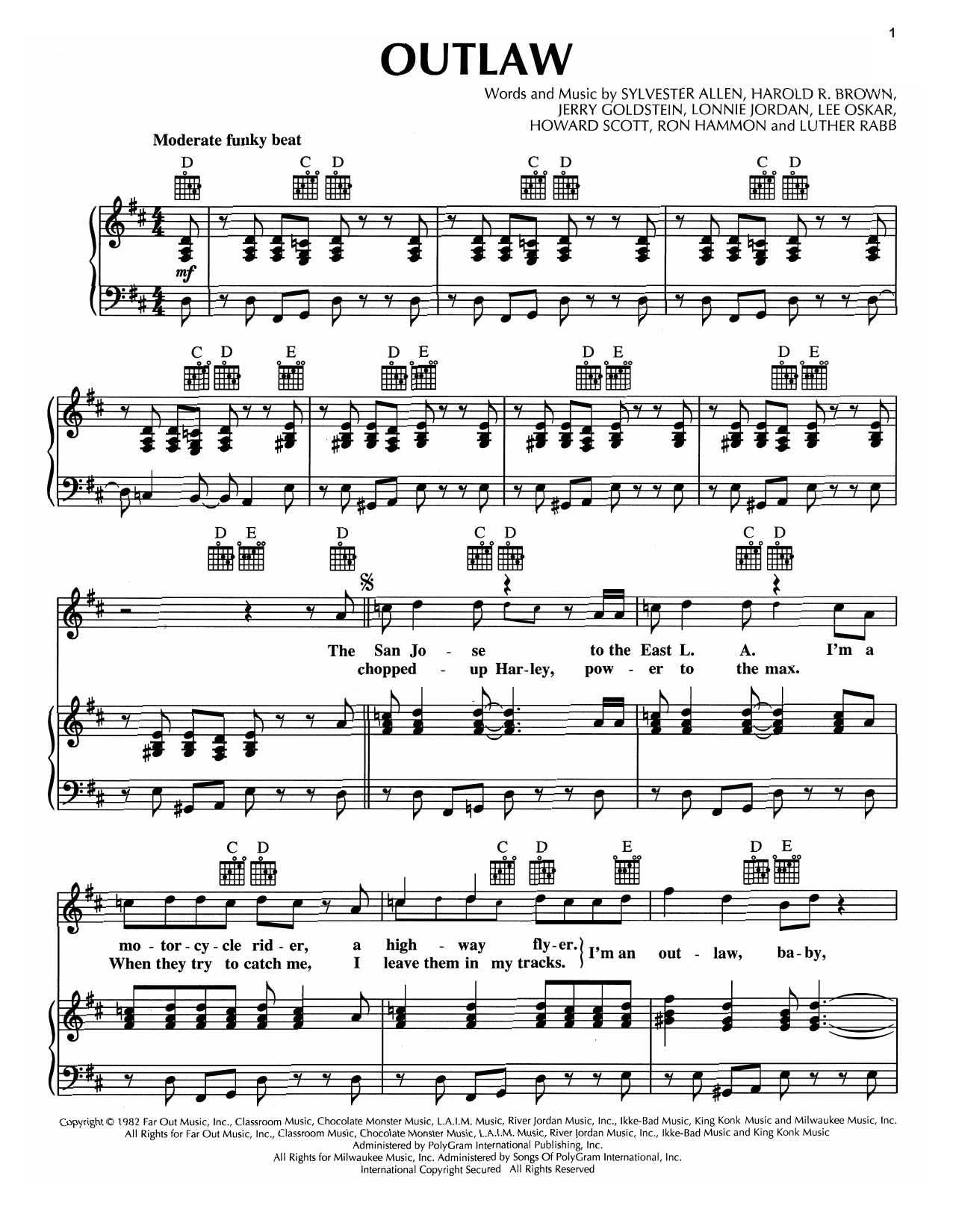 Download or print War Outlaw sheet music, chords and digital score arranged for Piano, Vocal & Guitar Chords (Right-Hand Melody). This Funk score includes 5 page(s).