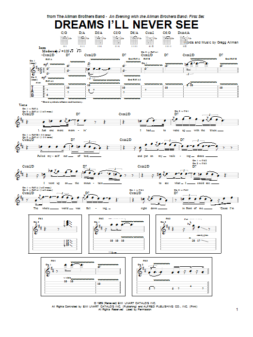 Download or print Warren Haynes Dreams I'll Never See sheet music, chords and digital score arranged for Guitar Tab. This Blues score includes 19 page(s).