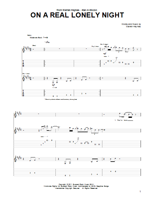 Download or print Warren Haynes On A Real Lonely Night sheet music, chords and digital score arranged for Guitar Tab. This Blues score includes 20 page(s).