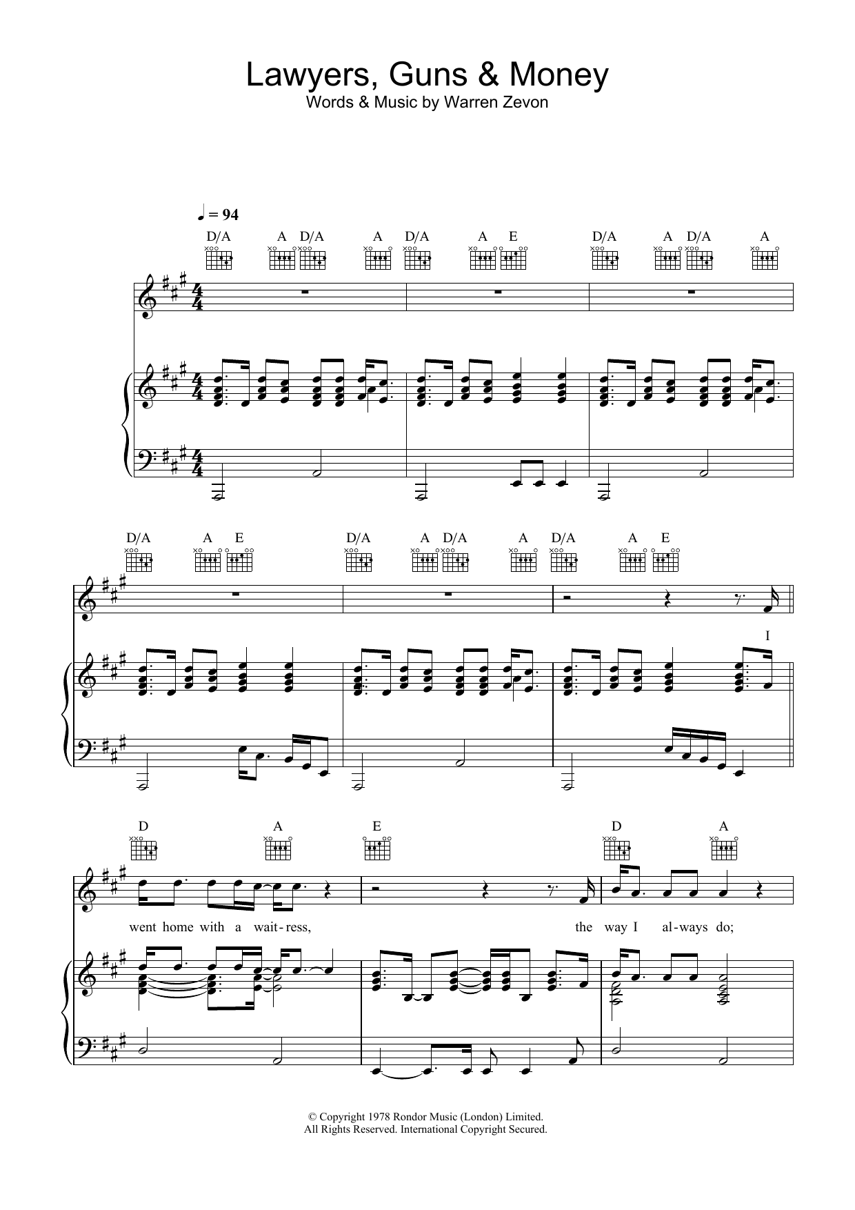 Download or print Warren Zevon Lawyers, Guns And Money sheet music, chords and digital score arranged for Piano, Vocal & Guitar Chords. This Rock score includes 5 page(s).