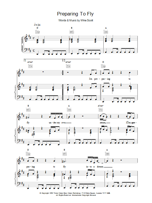 Download or print The Waterboys Preparing To Fly sheet music, chords and digital score arranged for Piano, Vocal & Guitar Chords. This Folk score includes 4 page(s).