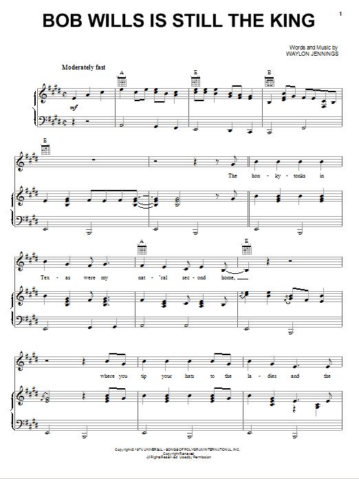 Download or print Waylon Jennings Bob Wills Is Still The King sheet music, chords and digital score arranged for Piano, Vocal & Guitar Chords (Right-Hand Melody). This Country score includes 6 page(s).