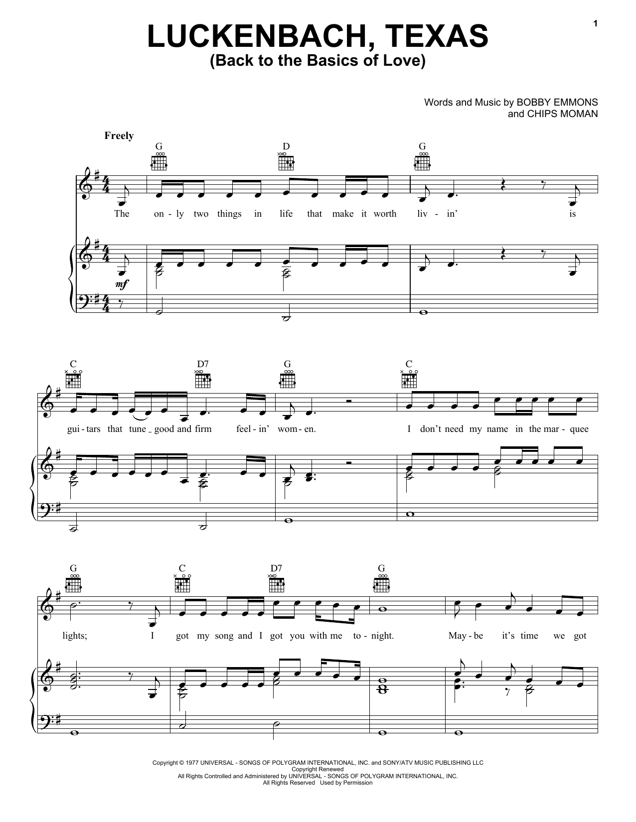 Download or print Waylon Jennings Luckenbach, Texas (Back To The Basics Of Love) sheet music, chords and digital score arranged for Easy Piano. This Country score includes 5 page(s).