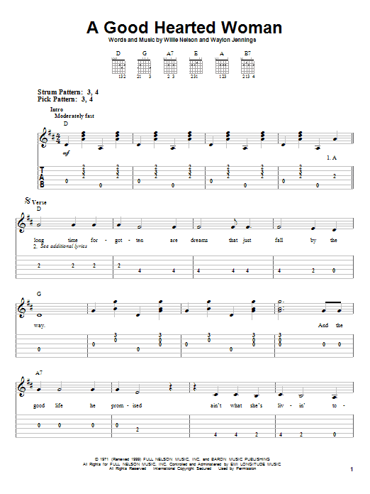 Download or print Waylon Jennings & Willie Nelson A Good Hearted Woman sheet music, chords and digital score arranged for Lead Sheet / Fake Book. This Country score includes 1 page(s).