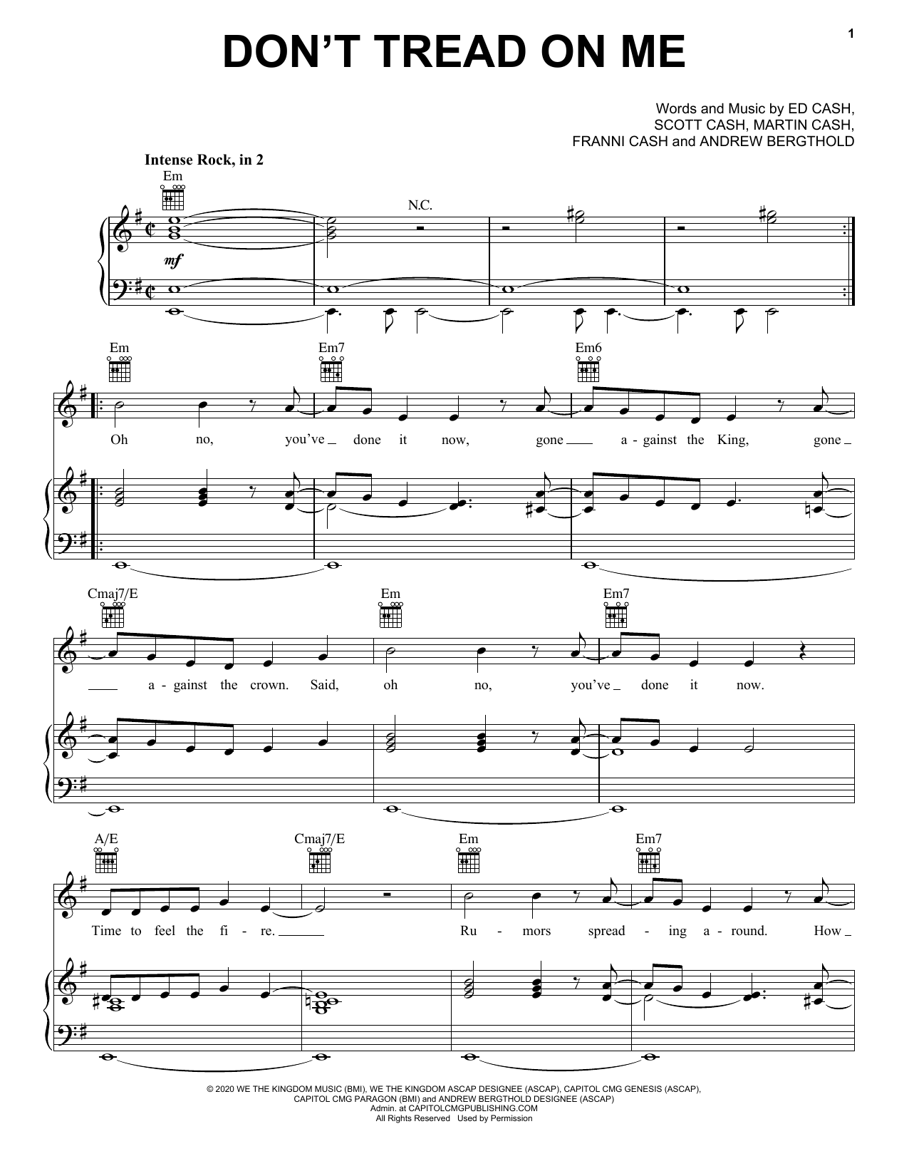 Download or print We The Kingdom Don't Tread On Me sheet music, chords and digital score arranged for Piano, Vocal & Guitar Chords (Right-Hand Melody). This Christian score includes 6 page(s).