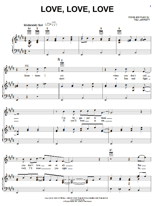 Download or print Webb Pierce Love, Love, Love sheet music, chords and digital score arranged for Piano, Vocal & Guitar Chords (Right-Hand Melody). This Country score includes 4 page(s).