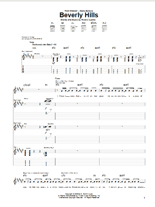Download or print Weezer Beverly Hills sheet music, chords and digital score arranged for Guitar Tab. This Alternative score includes 5 page(s).