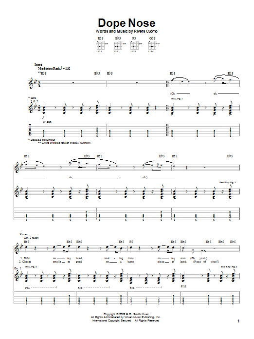 Download or print Weezer Dope Nose sheet music, chords and digital score arranged for Guitar Tab (Single Guitar). This Alternative score includes 6 page(s).