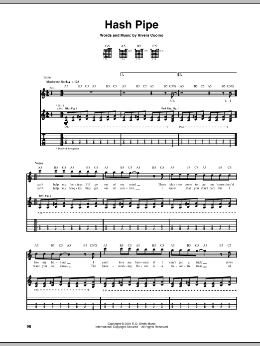 Download or print Weezer Hash Pipe sheet music, chords and digital score arranged for Guitar Tab (Single Guitar). This Alternative score includes 5 page(s).