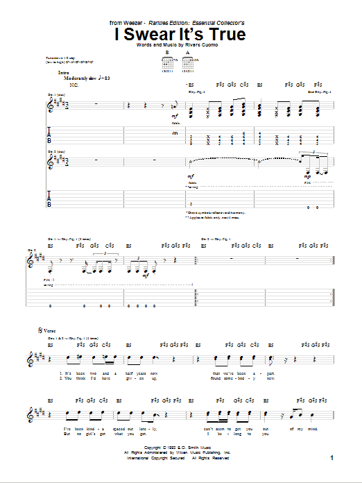 Download or print Weezer I Swear It's True sheet music, chords and digital score arranged for Guitar Tab. This Alternative score includes 4 page(s).