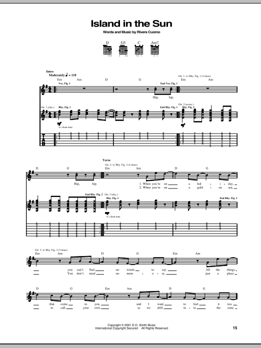 Download or print Weezer Island In The Sun sheet music, chords and digital score arranged for Piano, Vocal & Guitar Chords (Right-Hand Melody). This Pop score includes 4 page(s).