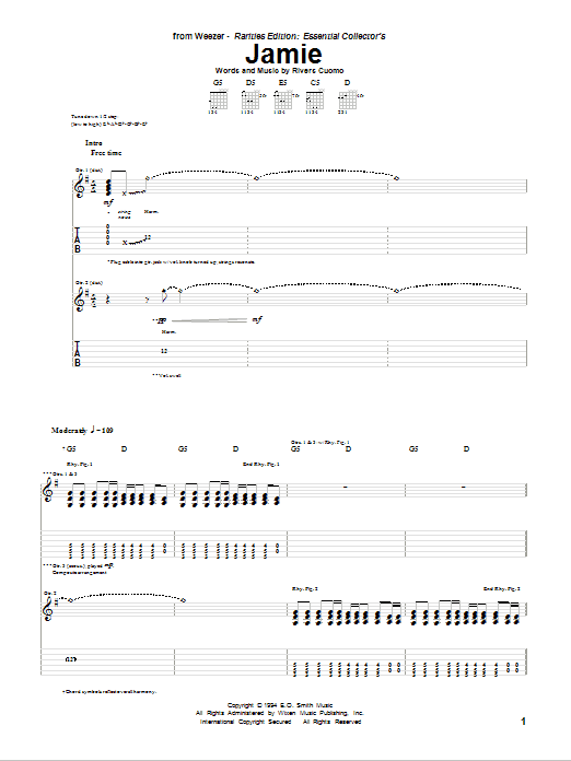 Download or print Weezer Jamie sheet music, chords and digital score arranged for Guitar Tab. This Alternative score includes 5 page(s).