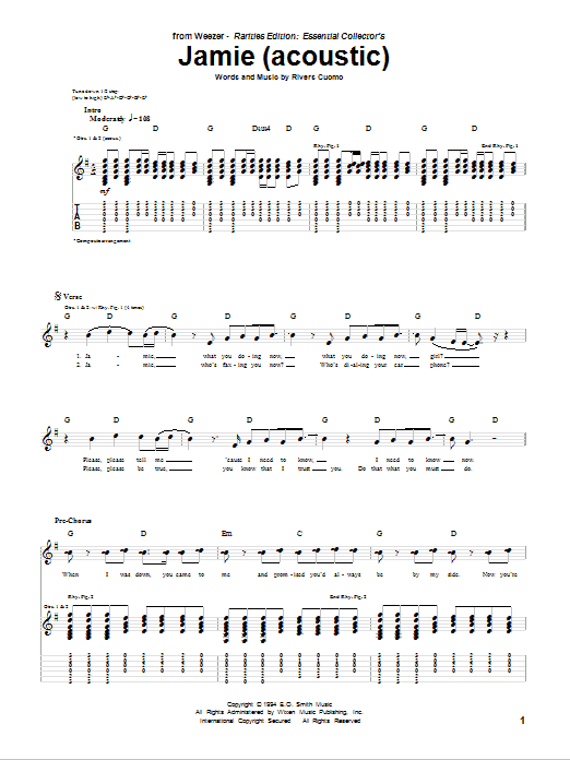 Download or print Weezer Jamie (Acoustic Version) sheet music, chords and digital score arranged for Guitar Tab. This Alternative score includes 5 page(s).